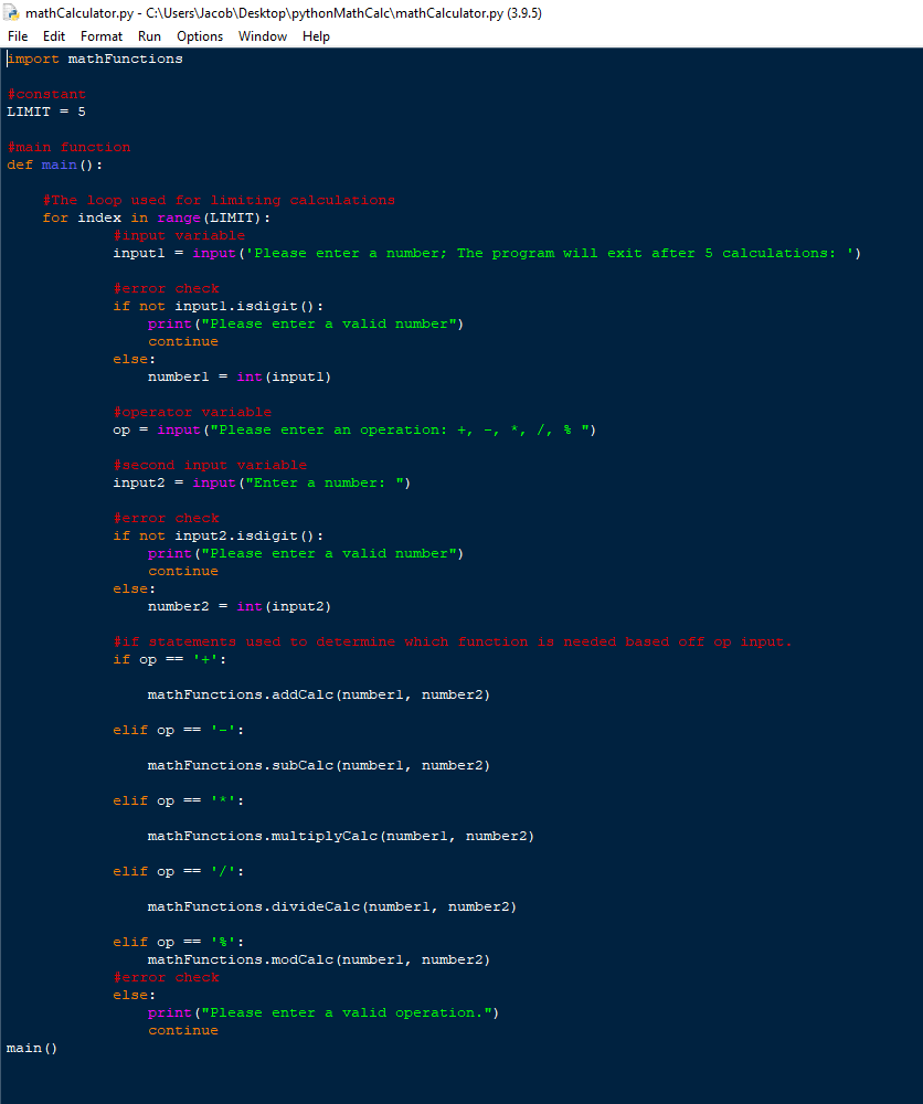 This is a custom python calculator I made which includes a imported python module, if statements, loops, variables, functions, keyboard input, constants, and calculations. Below is an image of the source code for the calculator along with the imported file of math functions the calculator requires.