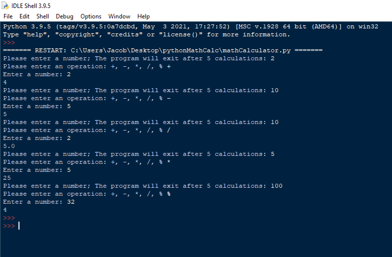 The calculator can perform addition, subtraction, multiplication, division, and modulo operations. The idea of importing these functions into the main file is that it is possible to easily import the functions for other purposes as well.